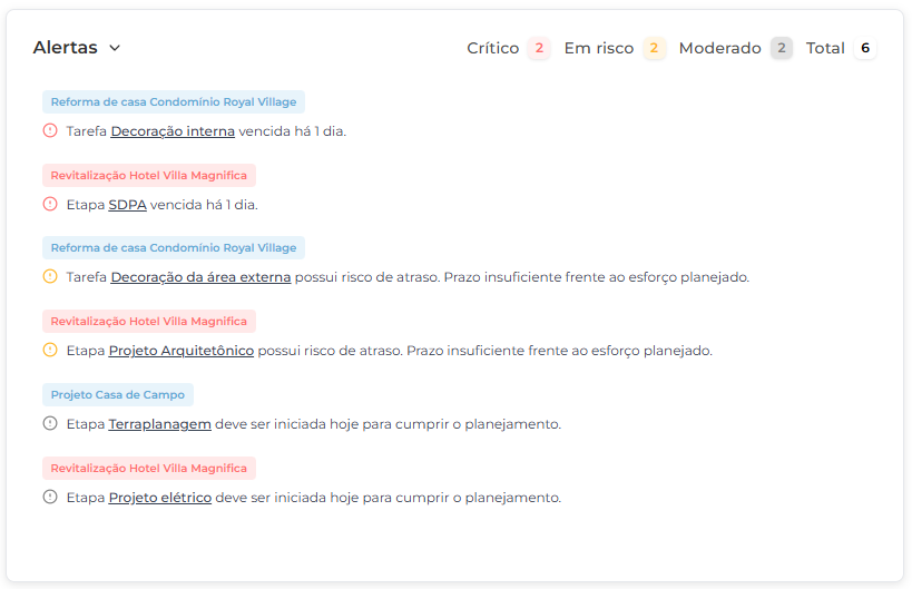 Monitore o progresso e antecipe gargalos com alertas automaticos e indicadores visuais.